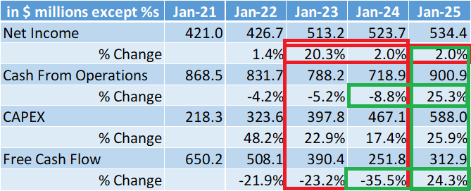 While net income growth has slowed, cash from operations and free cash flow have shown a marked improvement in fiscal 2024. The higher CAPEX over the last few years has certainly paid dividends in fiscal 2024 as BJ expanded into Tennessee, Alabama, and Kentucky.