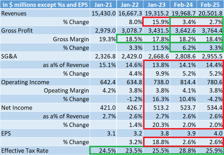This is pretty straightforward and self-explanatory. Growth has slowed down, and SG&A has grown faster than revenue growth. That would be a cause for concern for this fiscal year as BJ might end up missing on EPS due to the higher SG&A and a higher tax rate of 27%, as guided by the management.